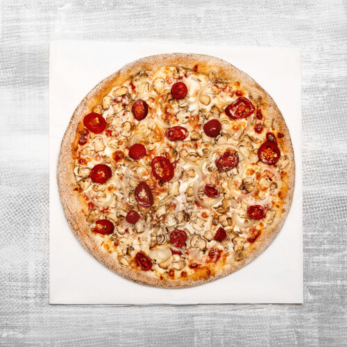 z sosem, mozzarellą, szynką, boczkiem wędzonym, pieczarkami, papryczką pepperoni, cebulą i oregano